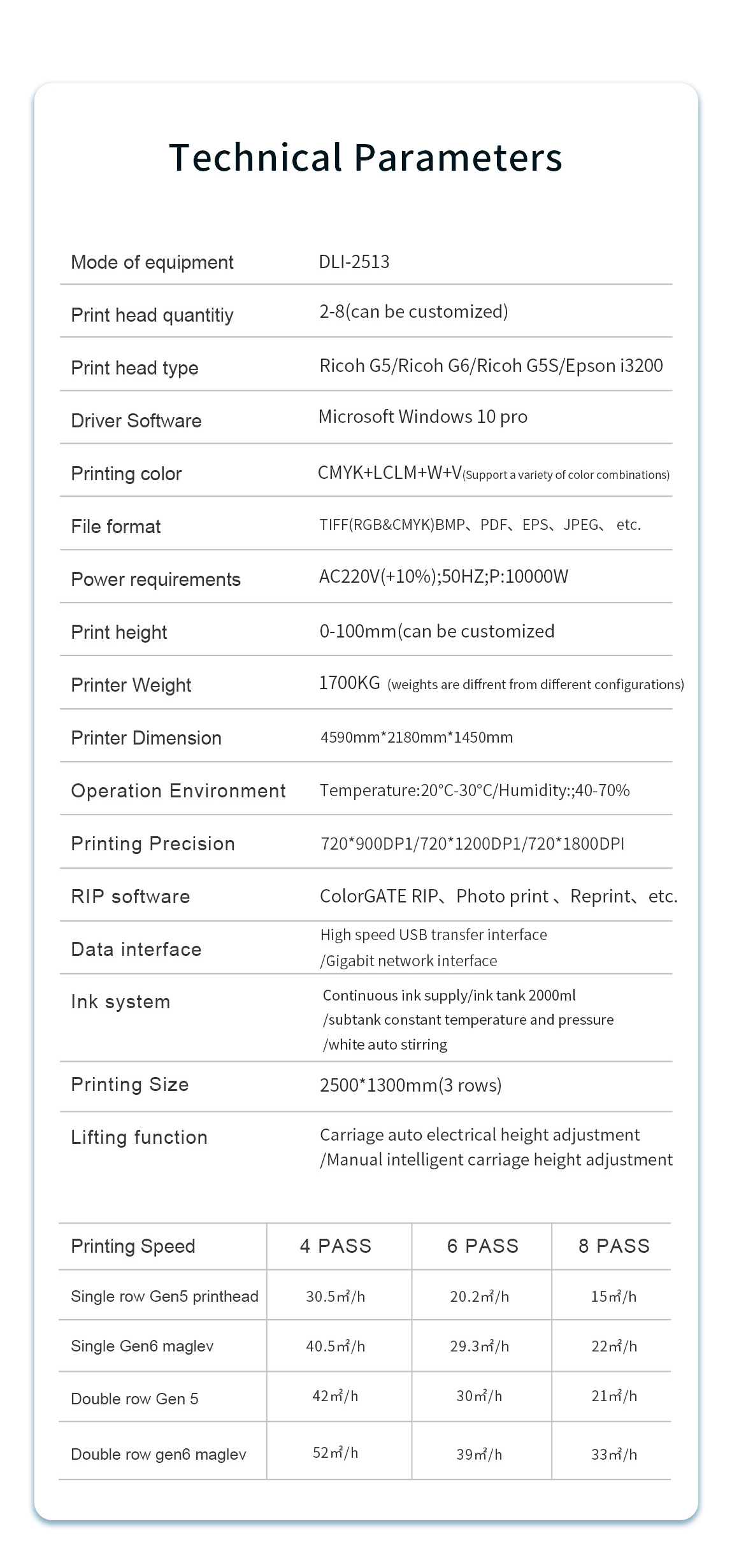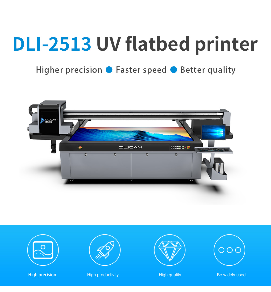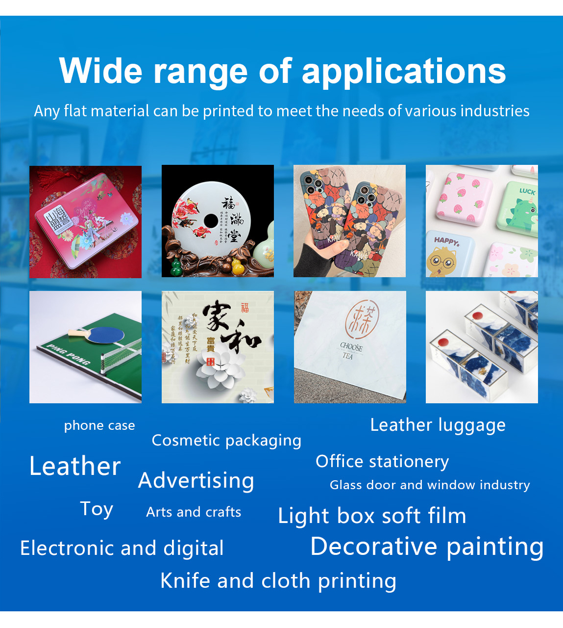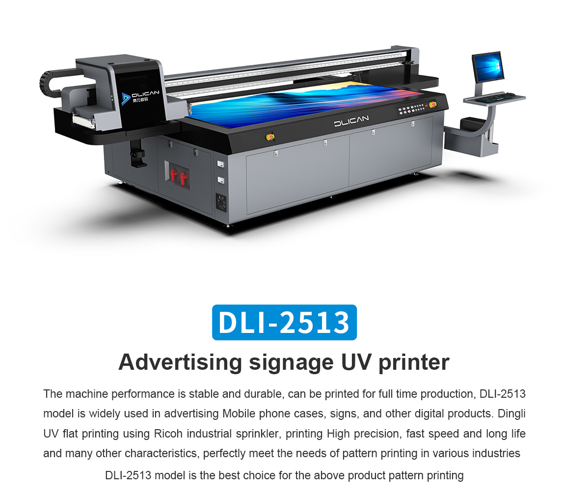 Product description:Maximum printing size 2.5m*1.3m, UV printer gold size, non-contact uv inkjet printing, that is, dry, no plate making, flexible response to a variety of printing···